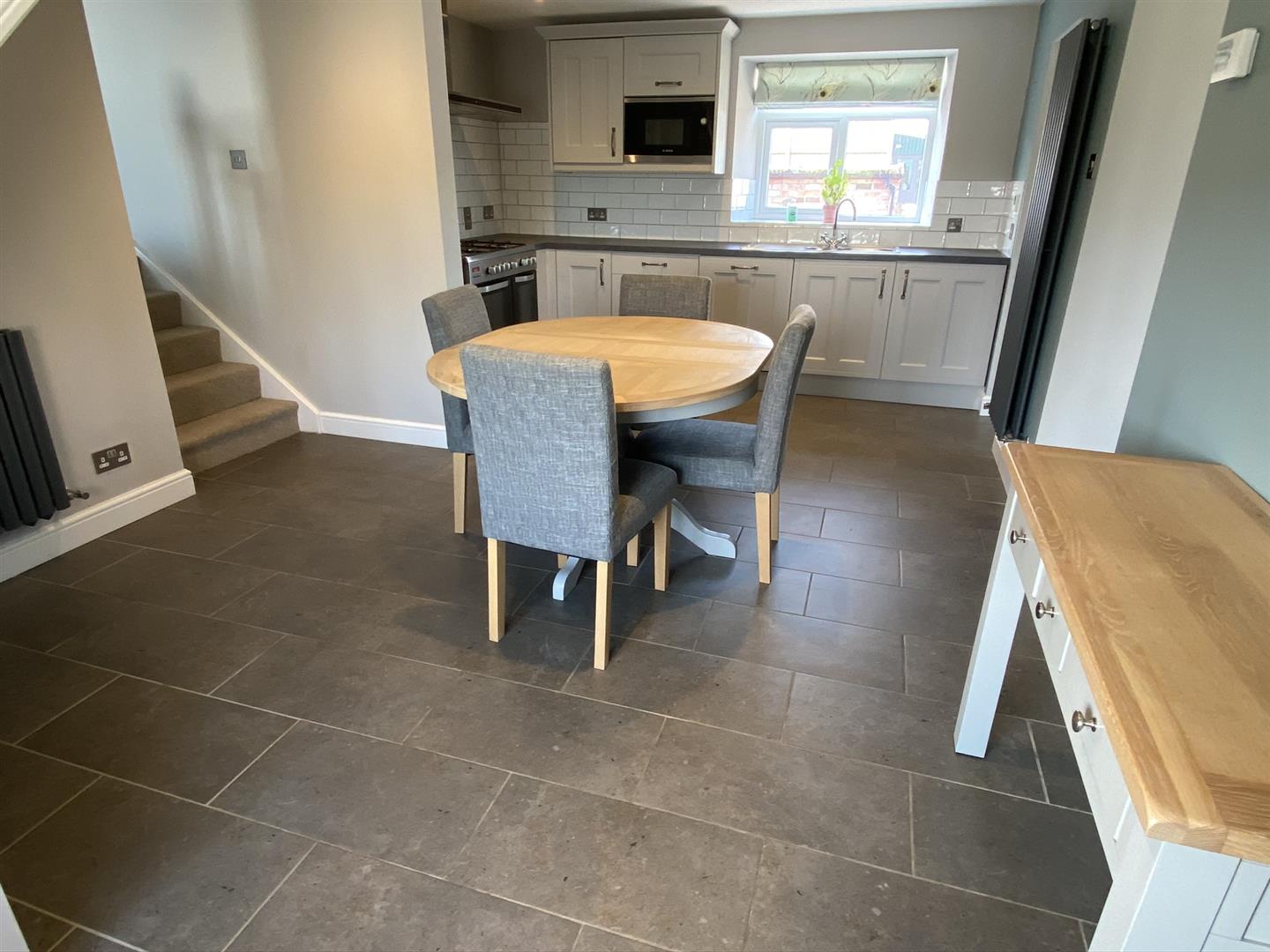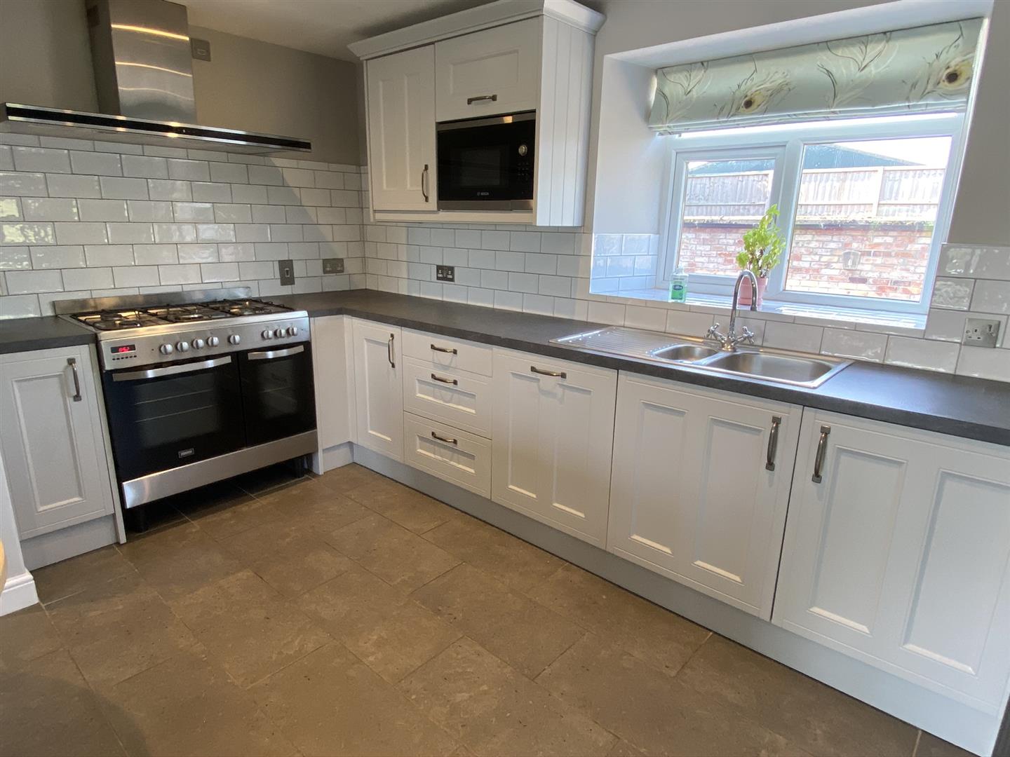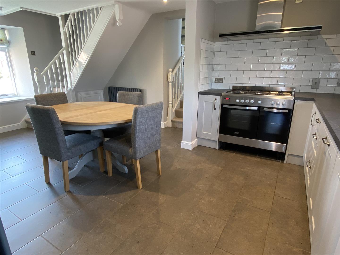 with range of white base and wall units, grey square edge worktops with tiled splashback and inset 1 ½ bowl stainless steel sink and drainer unit. Zanussi range gas cooker with gas hob and extractor hood over, integrated NEFF dishwasher and Bosch microwave. Two wooden double glazed windows to side and rear and upvc double glazed window to front. Two Grey central heating radiators, heat sensor, telephone point, grey tiled flooring with underfloor heating. Small under stairs storage cupboard off.