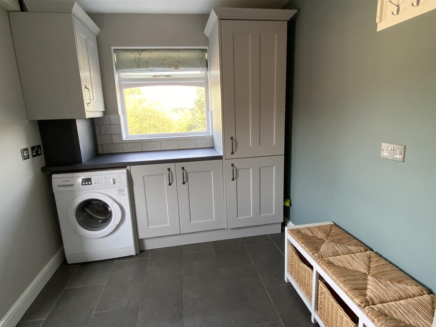 with range of white base and wall units, grey rolled edge worktops with tiled splashback, wooden double glazed window to side and Glow worm gas fired combination boiler. Bosch washing machine, integrated fridge/freezer, grey central heating radiator, coat hooks and grey tiled flooring with underfloor heating.