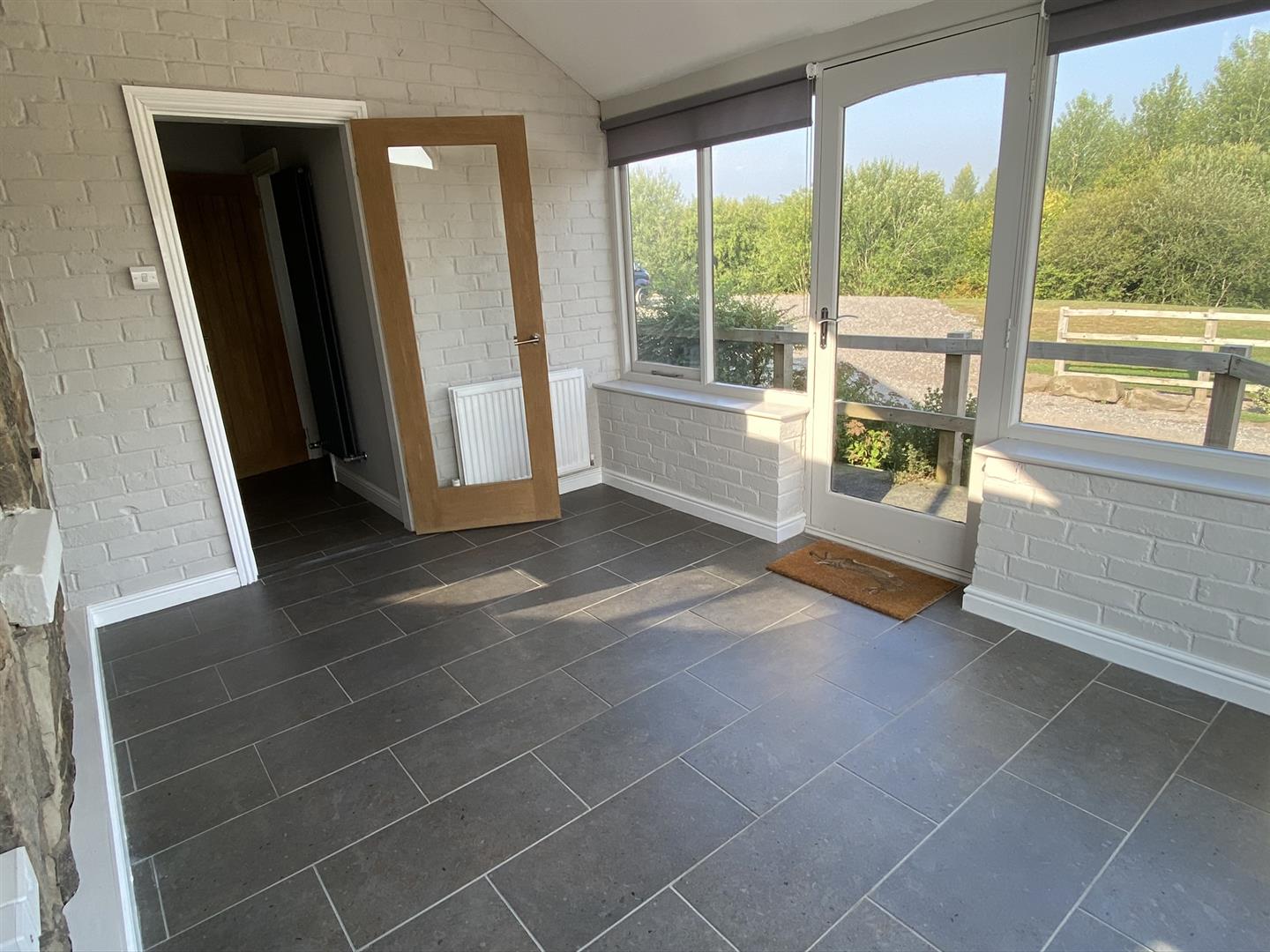 with wooden double glazed windows to side and rear with grey roller blinds, double central heating radiator and grey tiled flooring. Wooden double glazed door to rear.
