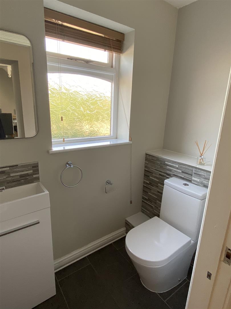 with 2 piece white suite consisting of a small vanity washbasin, low level w.c and wooden double glazed obscured window to side with Oak venetian blind over. Single central heating radiator, chrome towel ring and toilet roll holder, mirror and grey tiled flooring with underfloor heating.
