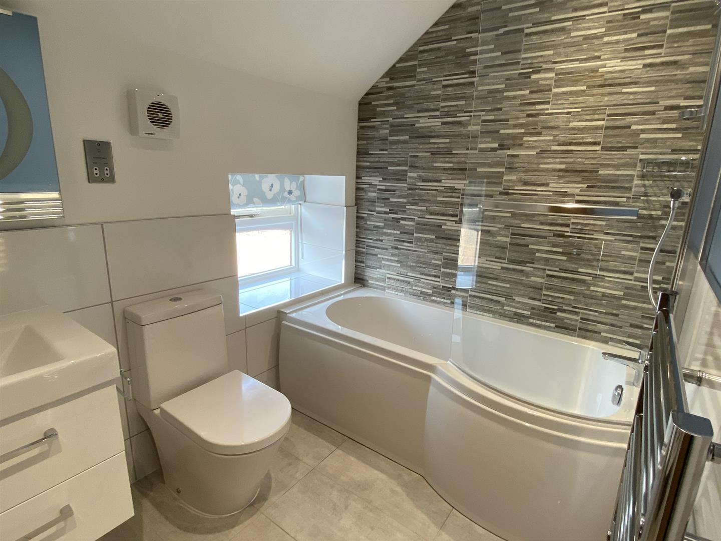 with 3 piece white suite consisting of a wall hung 2 drawer unit housing washbasin, low level w.c, P-shaped panelled bath with tiled surround and chrome power shower over. Wooden double glazed obscured window to front, chrome towel central heating radiator, extractor fan, shaver point, mirror with auto light and grey tiled flooring with underfloor heating.