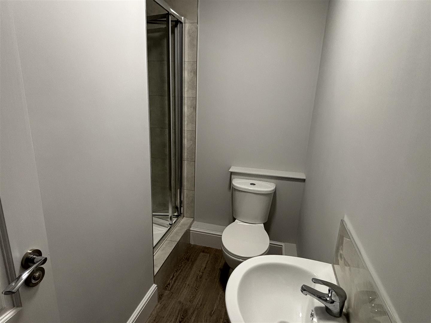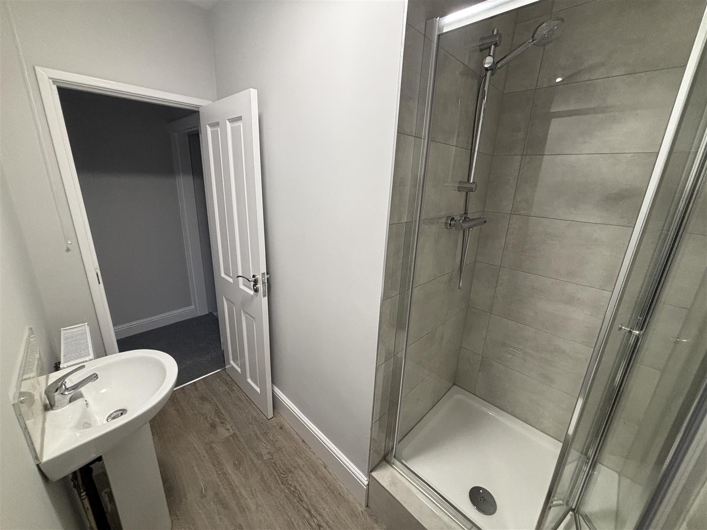 with 3 piece white suite consisting of a pedestal washbasin, low level w.c, shower cubicle with tiled surround and mixer shower over. Double central heating radiator and laminate effect vinolay flooring.